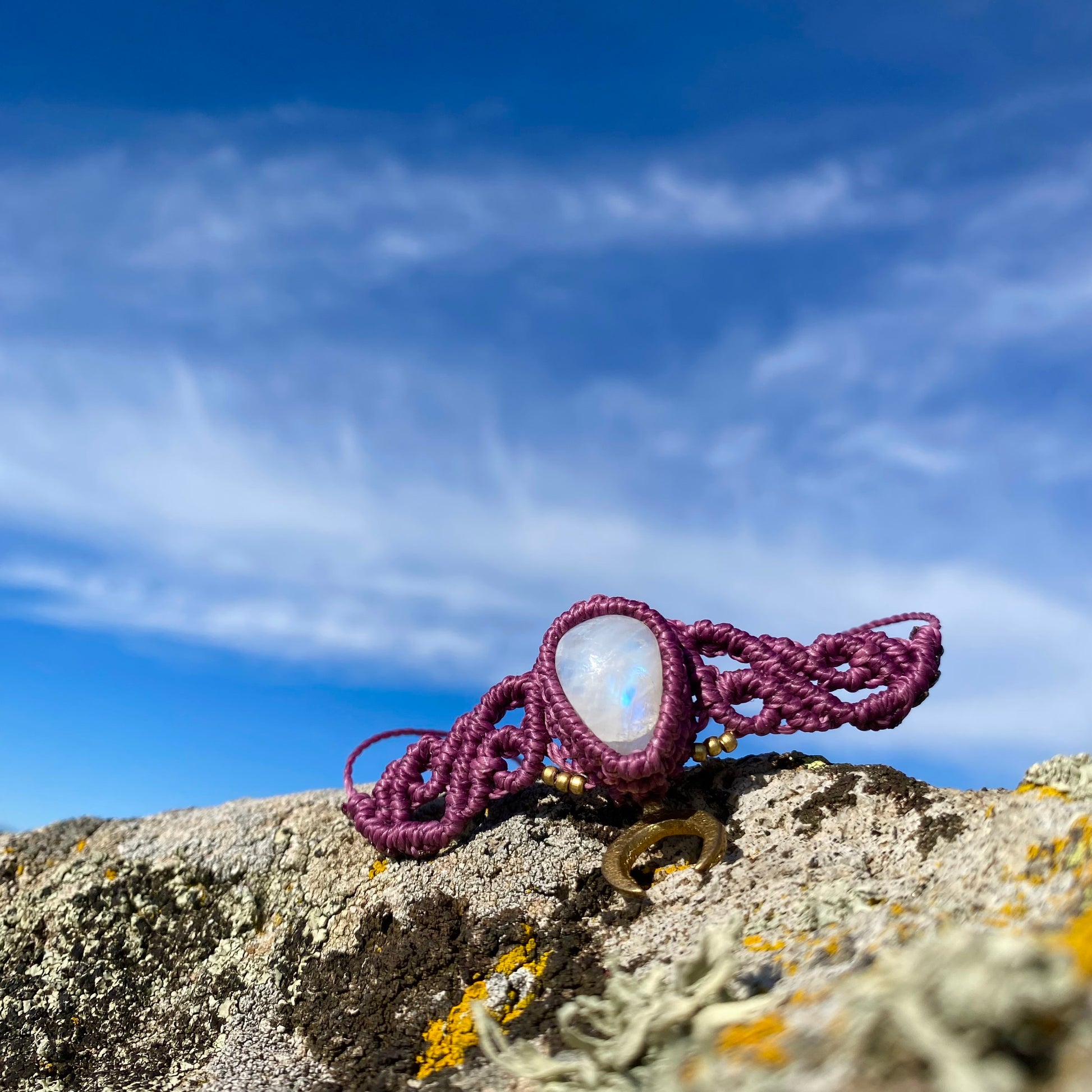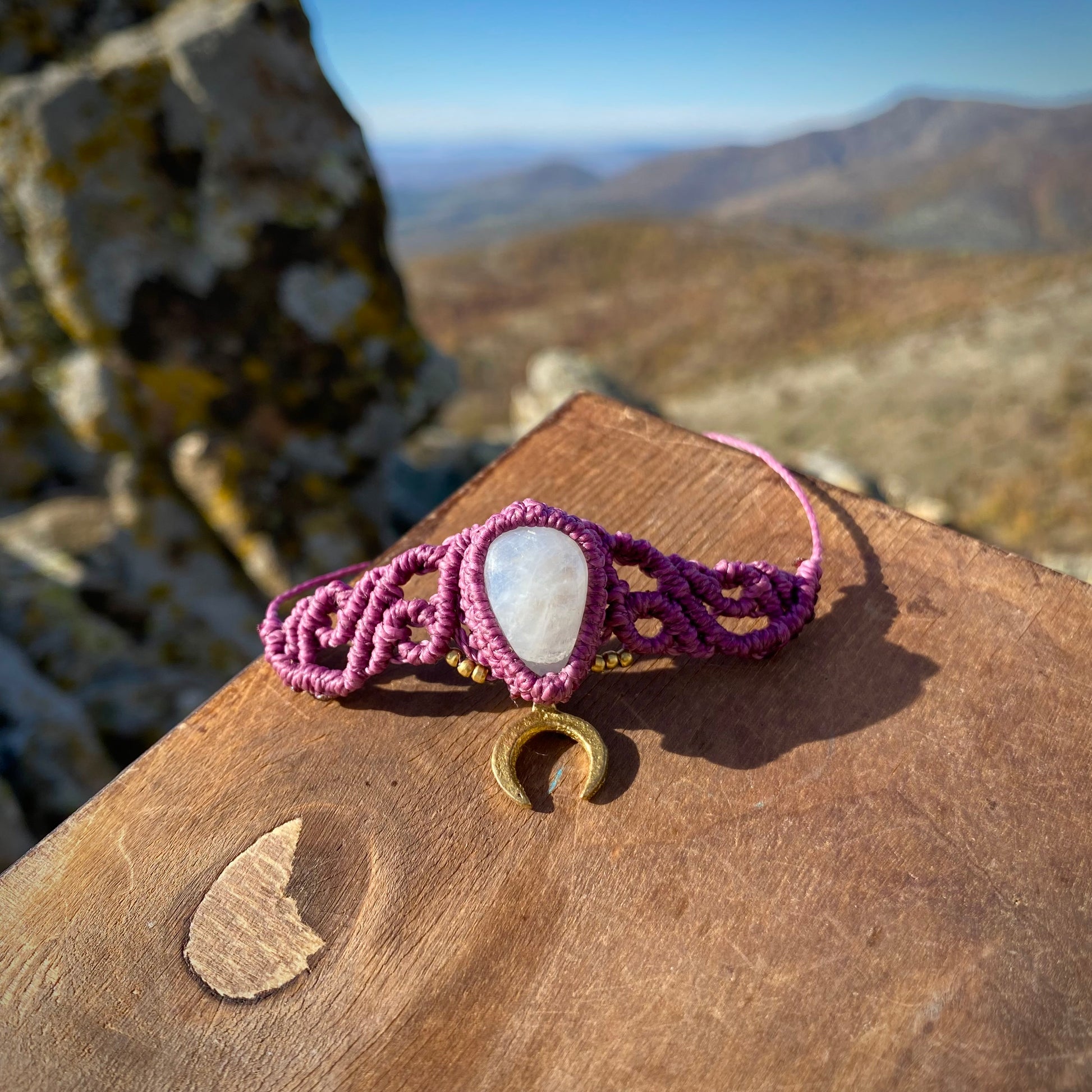 Moonstone Macrame Choker e rачно-изработен чокер со Макраме техника на плетење. Вметнатиот кристал се нарекува Месечев Камен.